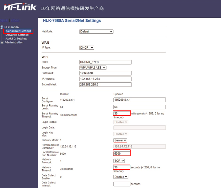 4、双极击Hi-Link图标,选择Serial2Net Setting,修改网络模式和服务端口号。注意:Apply保存后才能生效。
