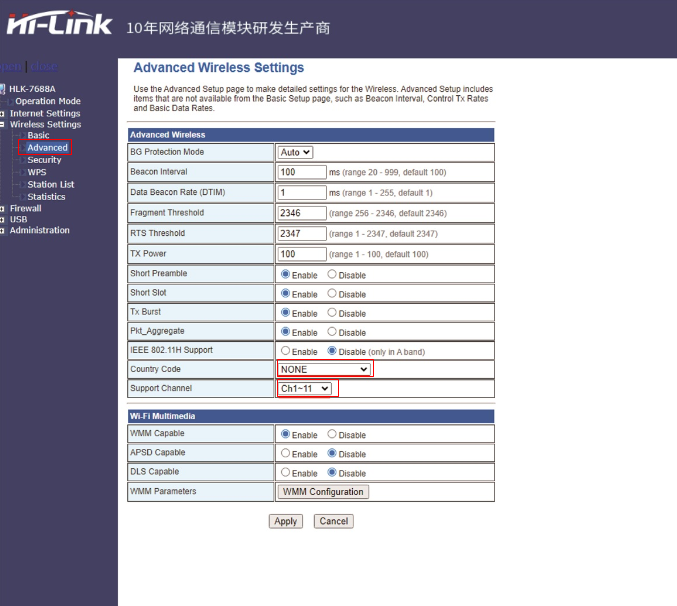 3、选择Advanced,修改信道范围1~11。