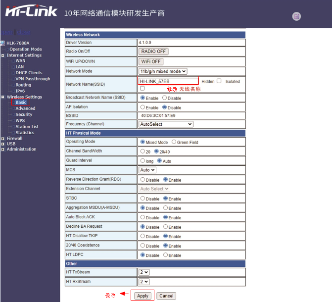 2、选择Basic,修改无线网络名称,然后Apply保存。