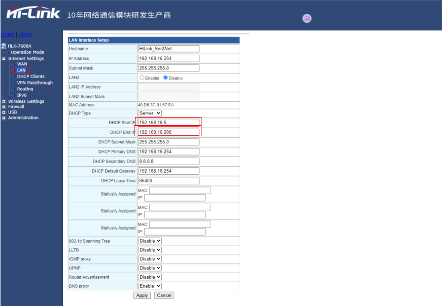 1、浏览器输入IP地址:192.168.16.254,进入设置界面。选择LAN修改DHCP范围可设置0~255。