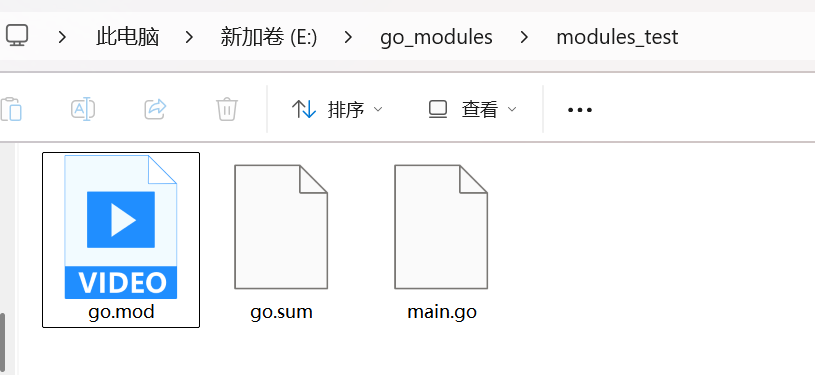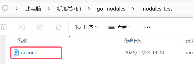 创建项目目录:在 E 盘下的 go_modules 文件夹下创建项目目录为 modules_test。