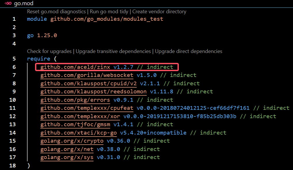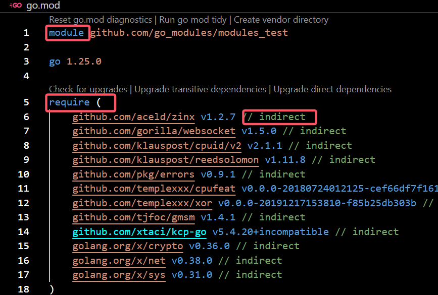 // indirect:表示该模块为间接依赖。项目直接依赖的是 znet 包,间接依赖 zinx 包。