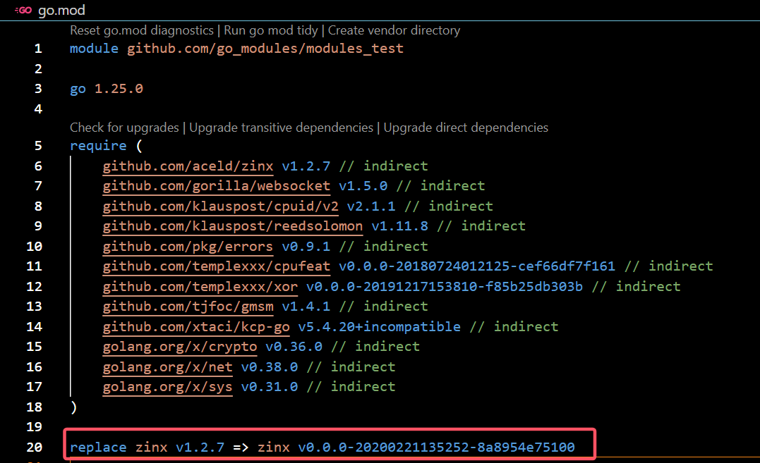 当前的 go_modules/modules_test 项目,依赖一个叫github.com/aceld/zinx库的,znet和ziface只是zinx的两个模块。