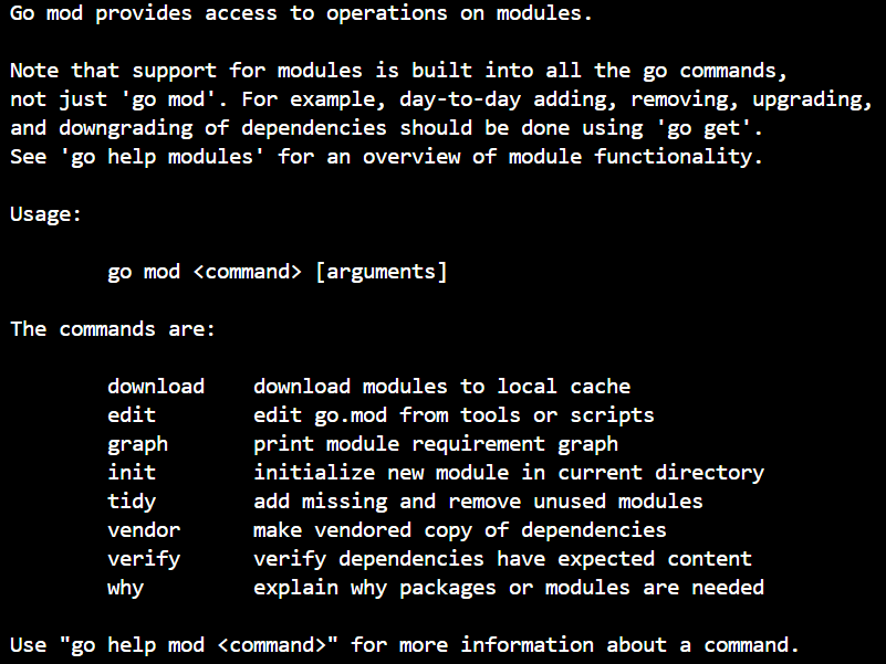 | go mod download | 下载go.mod 文件中指明的所有依赖 |