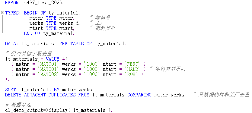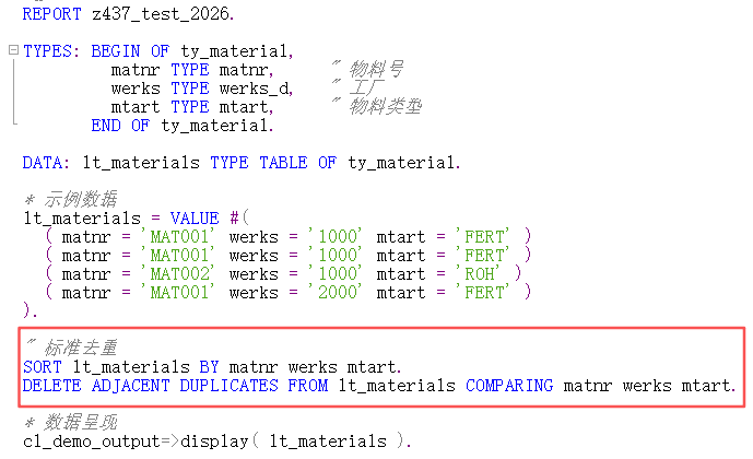 在最近的开发过程中,有遇到内表出现重复行数据的情况,需要对其进行去重处理,特此进行以下记录,便于后续回顾与查阅