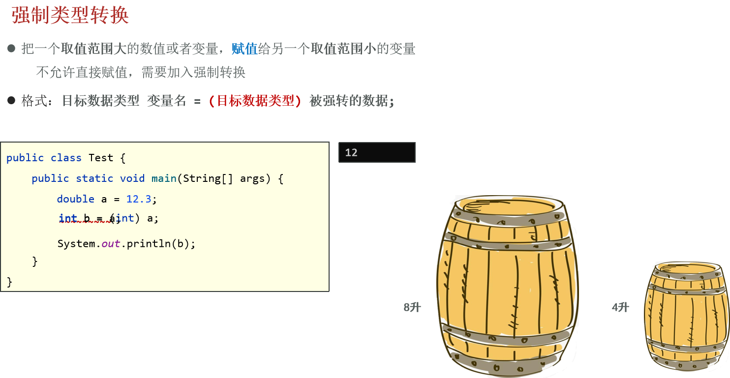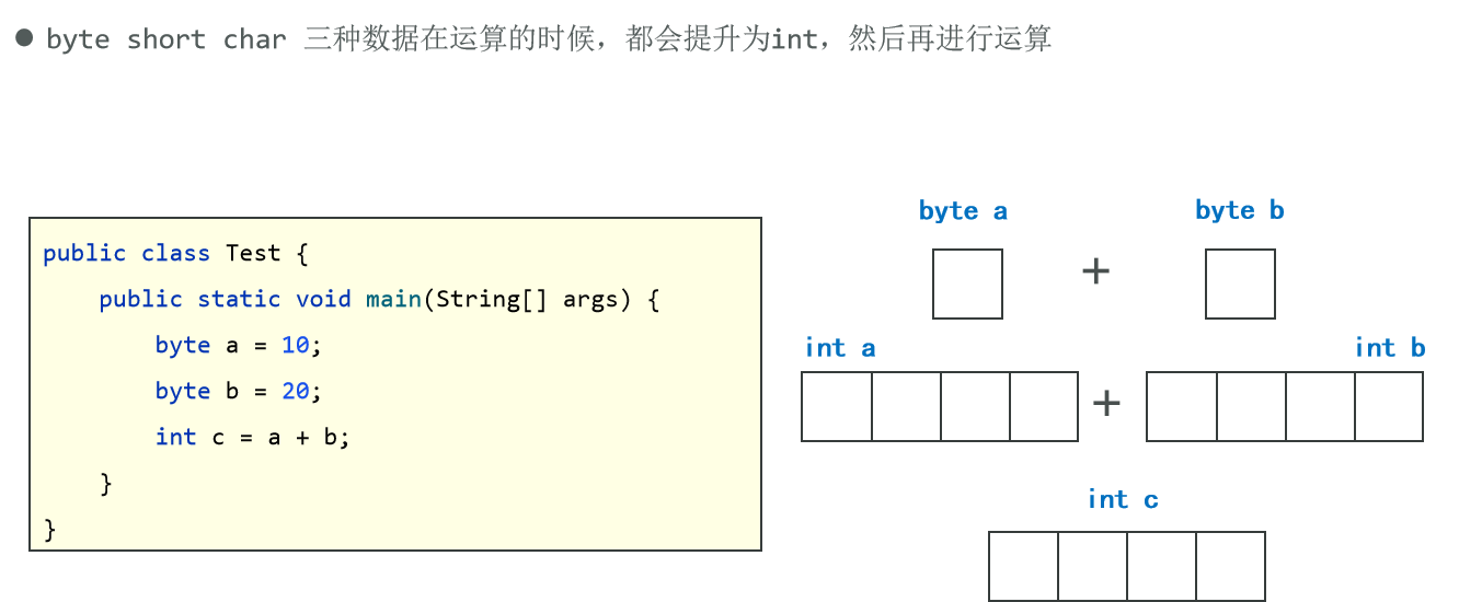 错误原因:b1 和 b2 是 byte 类型数据,相加时会自动提升为 int 类型(Java 的运算类型提升规则),最终结果是 int 类型;将 int 类型值直接赋值给 byte 类型变量,属于 "大类型赋值给小类型",会导致编译错误。