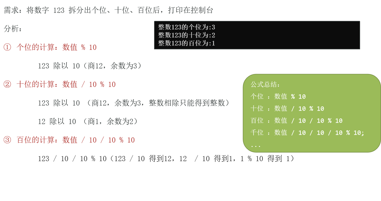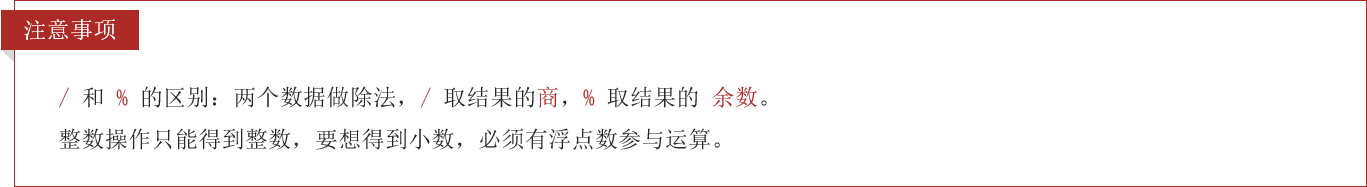 | % | 取余 | 获取的是两个数据做除法的余数 |