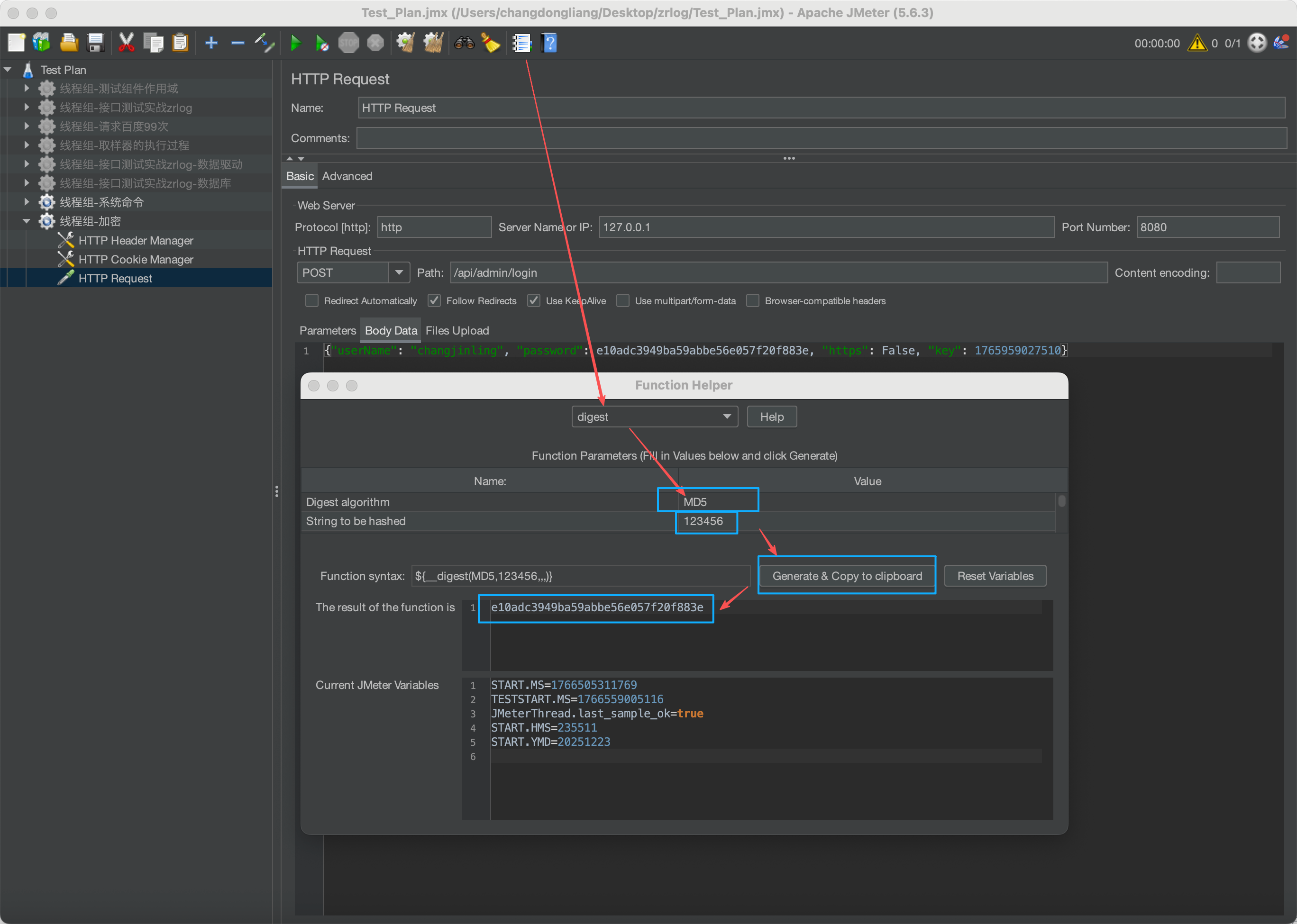 比如登录接口 密码要求MD5加密,函数中就选择digest,然后输入MD5和需要加密的密码,生成加密后的数据值。