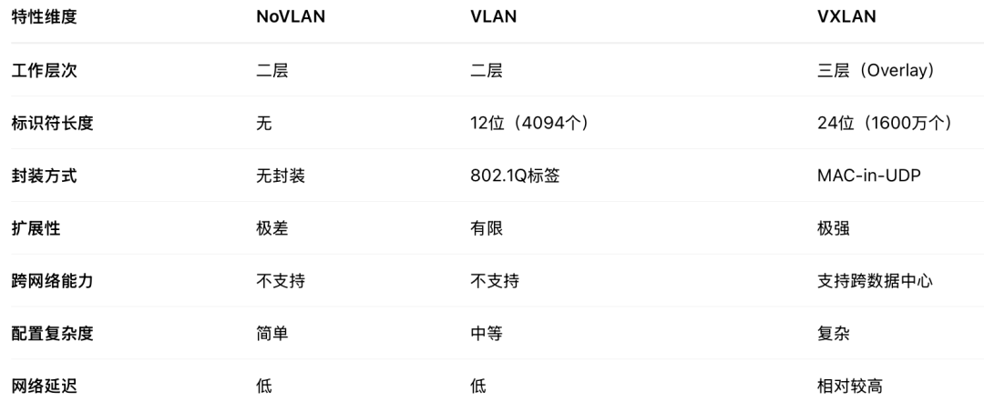 随着企业数字化转型的深入和云计算技术的普及,传统网络技术面临严峻挑战。在早期的扁平网络中,所有设备处于同一广播域(NoVLAN),存在严重的安全和性能隐患。随后出现的VLAN技术通过逻辑隔离解决了广播风暴问题,并在企业网中广泛应用,但VLAN模式也存在一定的局限性,其仅4094个的网络数量上限和有限的跨三层网络能力,已无法满足大规模、多租户云环境对海量虚拟网络、灵活迁移和强大隔离的需求。为了突破这些限制,支持在IP网络上构建大规模、 Overlay虚拟网络的VXLAN技术应运而生,成为现代数据中心和云平台的核心网络基石。