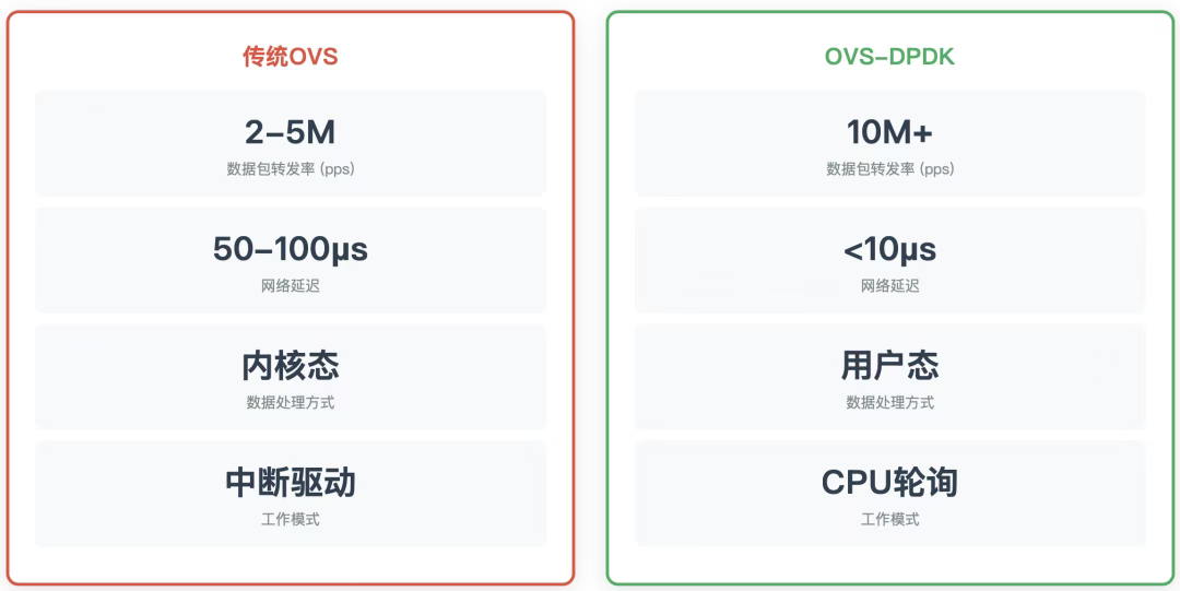 正是为了突破这一性能壁垒,OVS-DPDK 技术栈应运而生。它代表了另一种设计哲学:通过数据平面开发工具包(DPDK) 这类用户态I/O技术,将整个数据包处理过程从内核"旁路"到用户空间应用程序中。这种方法通过轮询、大页内存和亲和性绑定等技术,极大地减少了处理开销,实现了接近线速的高吞吐量和稳定的低延迟。因此,Linux Bridge 和 OVS-DPDK 是虚拟化网络发展不同阶段和针对不同需求的代表性技术产物。