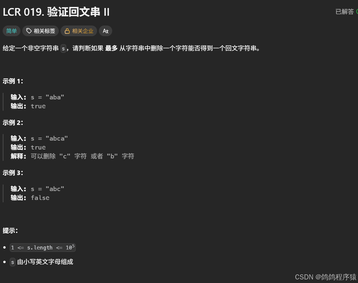 只需要双指针前后便利字符串,当遇到不相同的字符,就减去一个字符看剩下还是不是回文字符串即可。