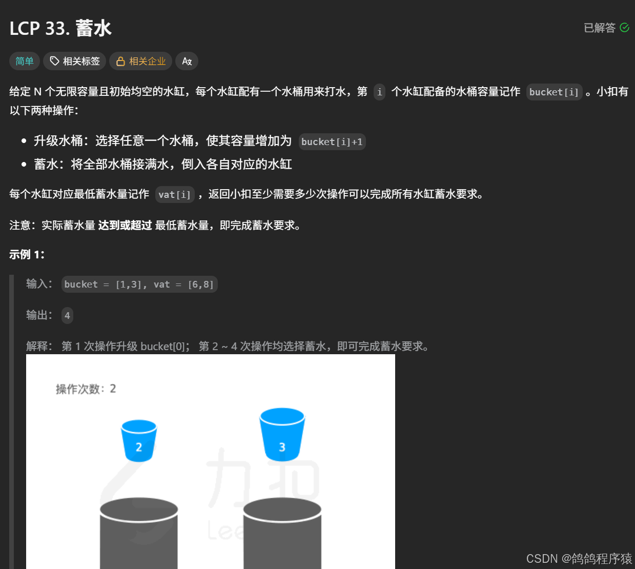 先找到水桶最大容量,就是水桶最多升级的次数。对于第 j 个水桶需要的「升级水桶」操作次数为 i - bucket[ j ]