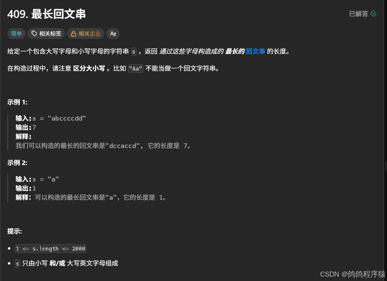 使用一个标记,记录没有构成回文串的字符数,为返回结果时要不要加上一个独立的字母放中间做判断。