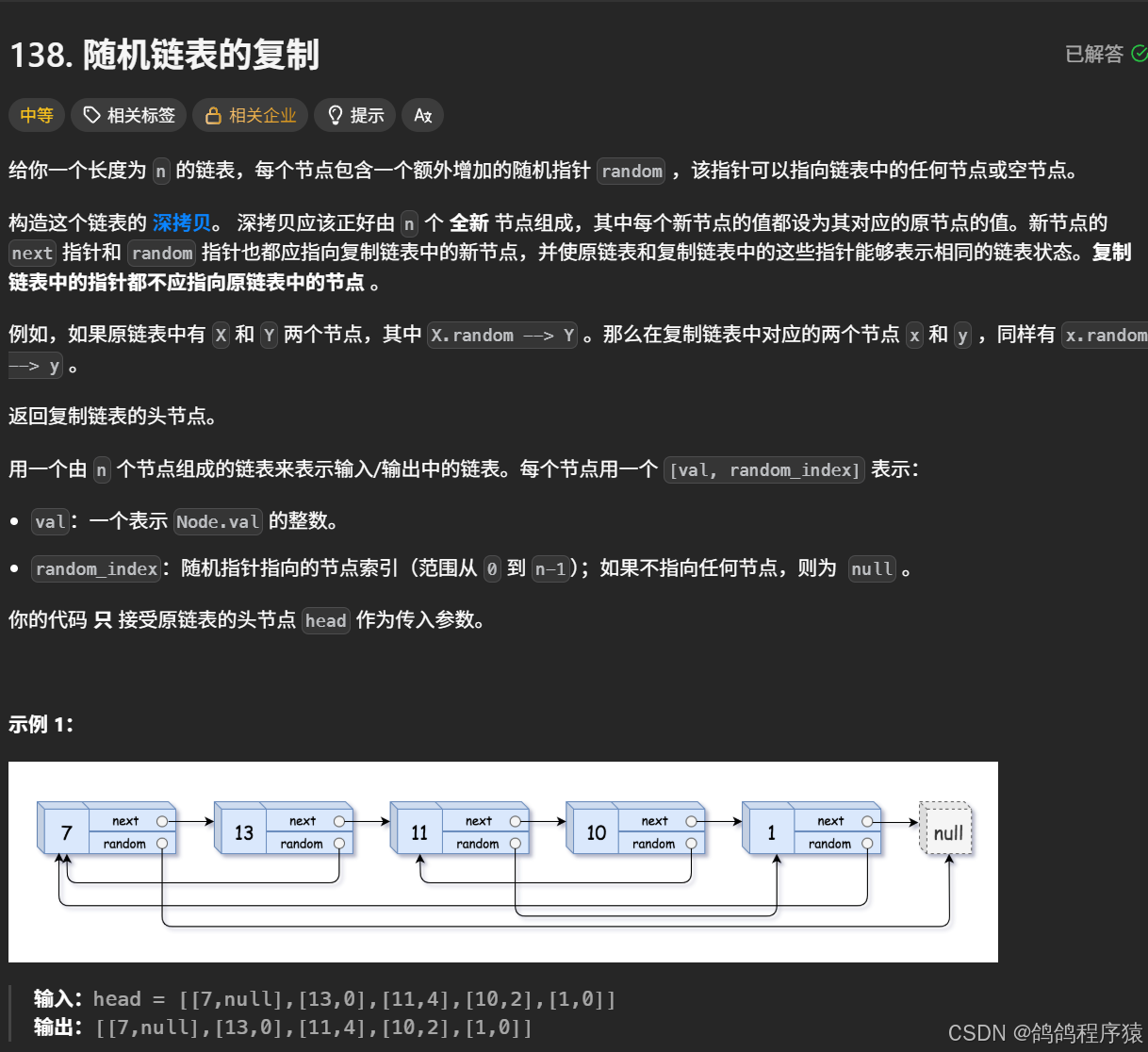 思路就是hash表 + 递归,hash表中就存储新老节点之间的对应,我们递归遍历head链表中的节点,当前节点在hash表中没有的时候,就拷贝,拷贝的新节点的next和random就递归调用函数即可完成拷贝。