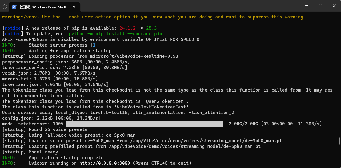 docker run --name vibevoice -p 3006:3000 --gpus all -v E:\dify\vibe-vioce:/app -w /app/VibeVoice -it --rm nvcr.io/nvidia/pytorch:24.07-py3 bash -c "apt update && apt install -y git libsndfile1 ffmpeg && export HF_ENDPOINT=https://hf-mirror.com && pip install -e . && python demo/vibevoice_realtime_demo.py --model_path microsoft/VibeVoice-Realtime-0.5B"