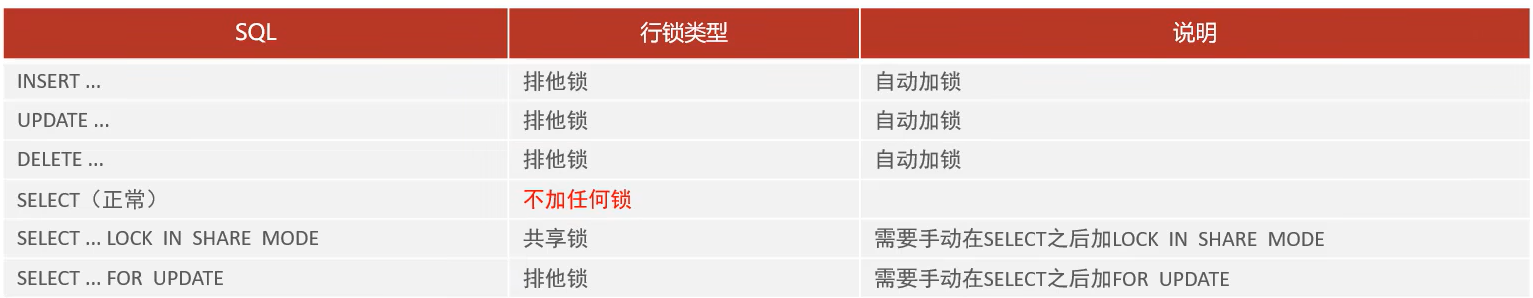 - 行级锁:在一行记录上加锁,每次操作锁住对应的行数据