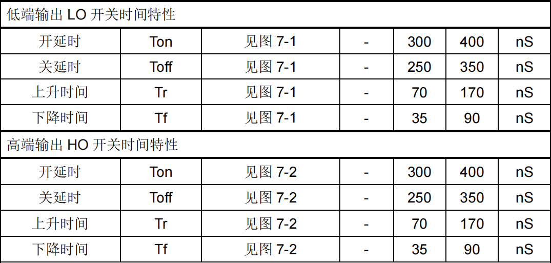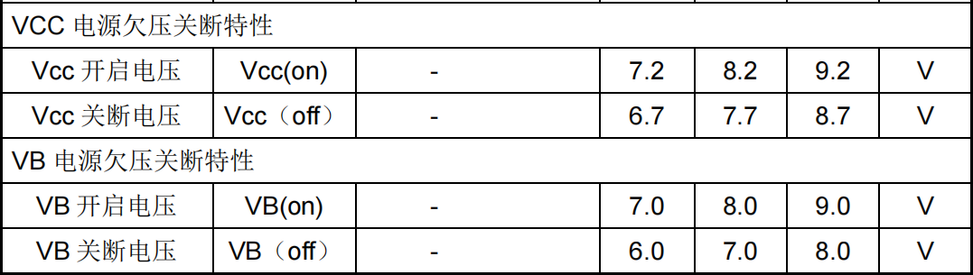 - VB欠压保护 开启电压 8.0V(典型),关断电压 7.0V(典型)