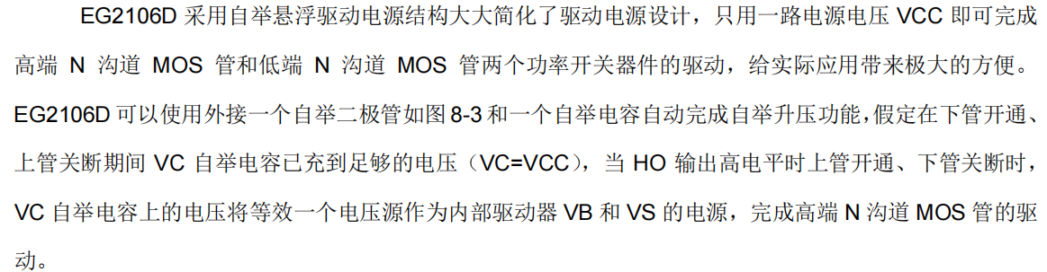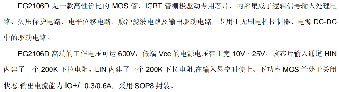 EG2106D 是一款采用高压悬浮自举电源架构的半桥栅极驱动专用芯片