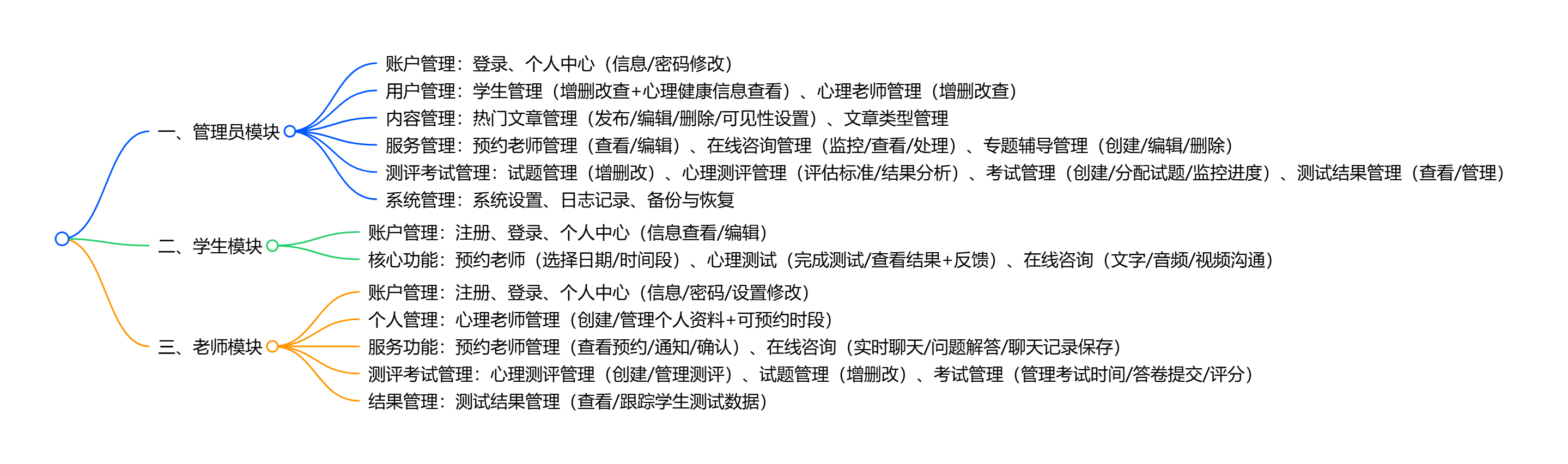 - 学生:支持注册登录与个人信息管理,可预约心理老师、完成心理测试并查看结果反馈、通过文字 / 音频 / 视频形式进行在线咨询,获取心理健康支持。