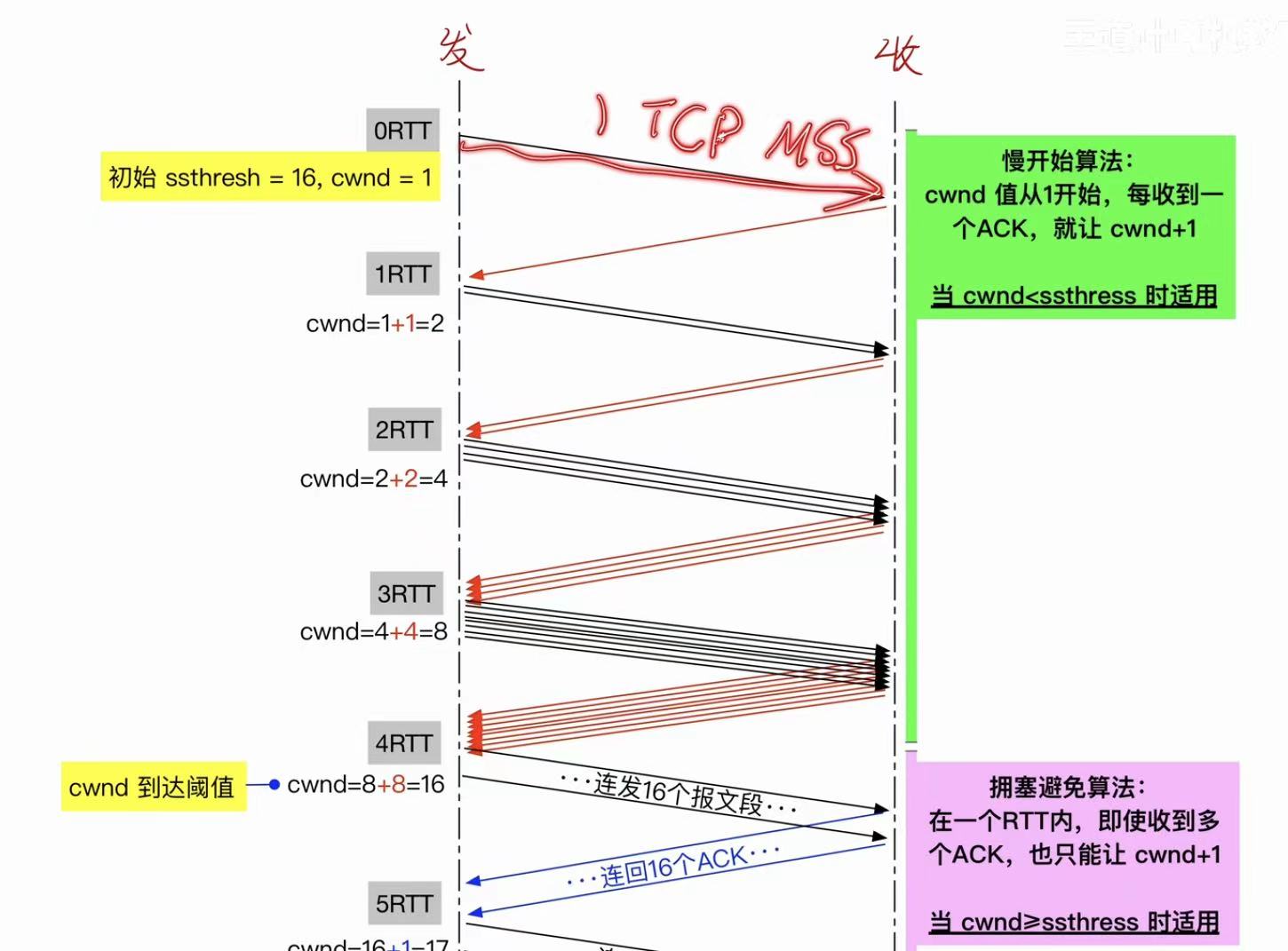 最开始:cwnd翻倍地增长:1-->2-->4-->8-->16
