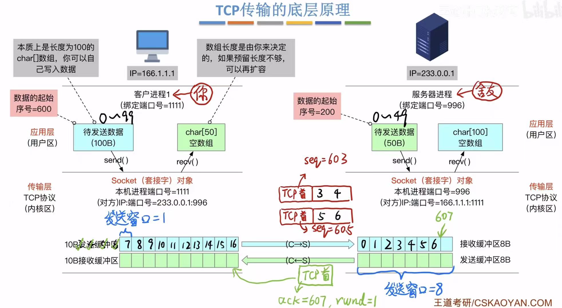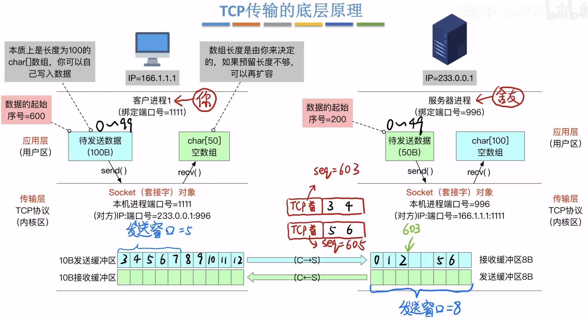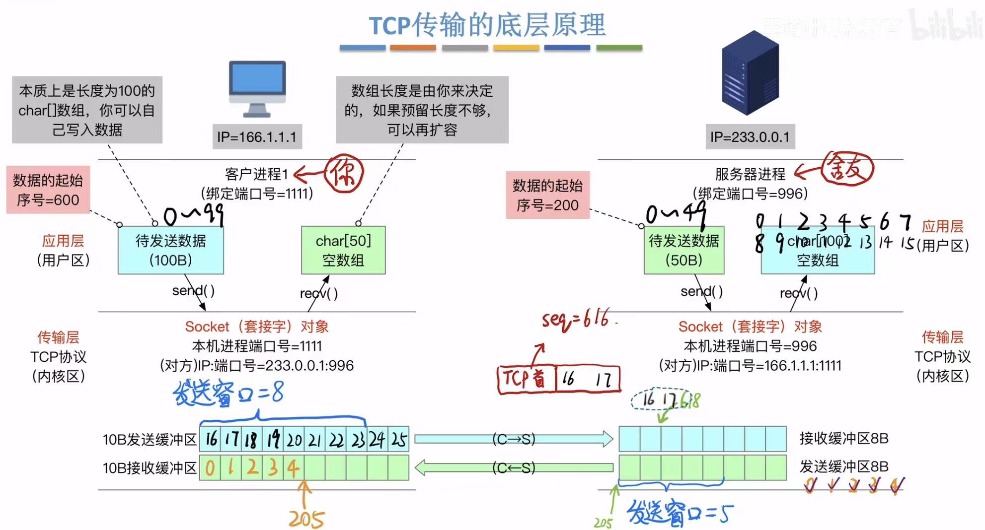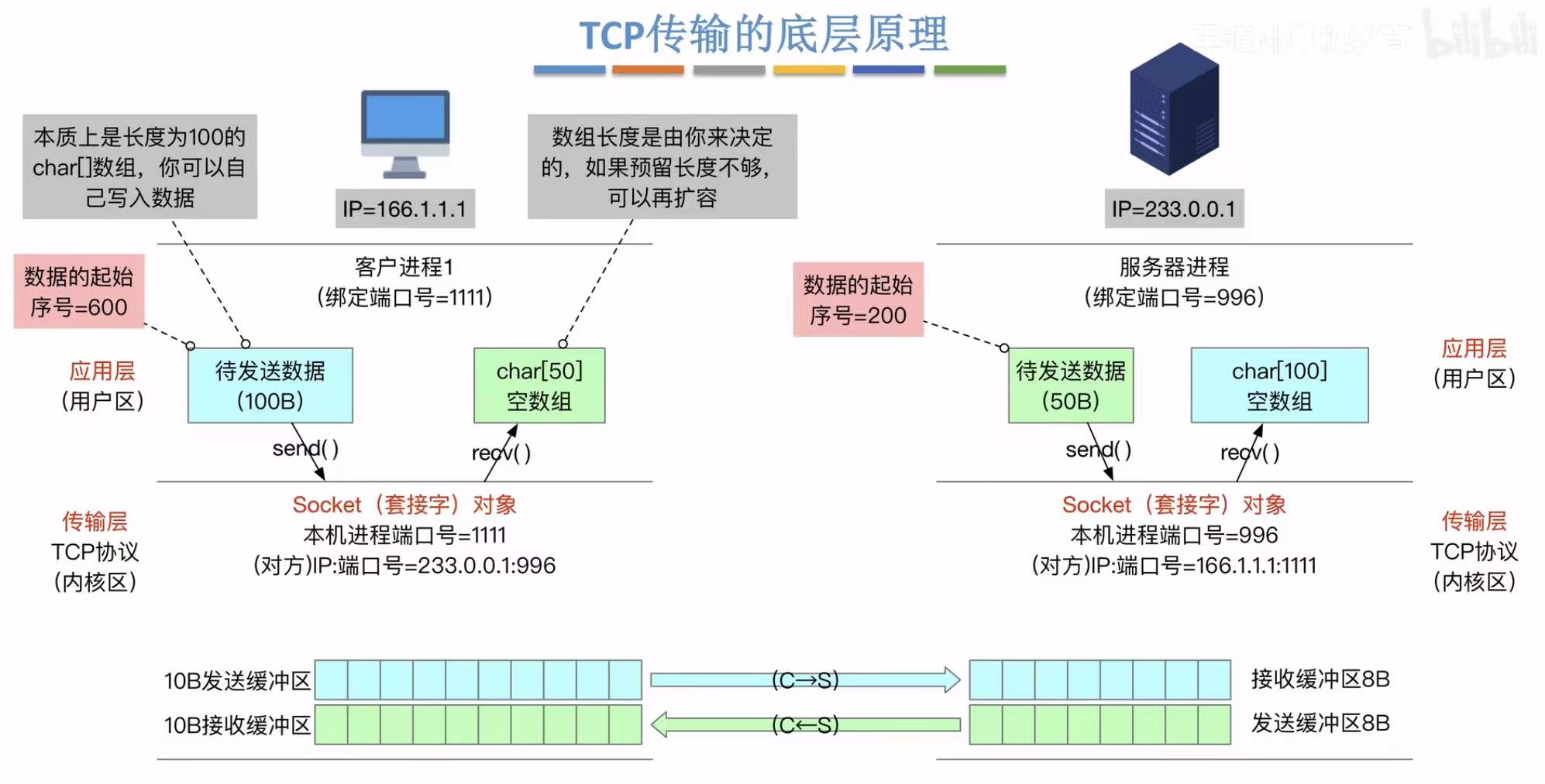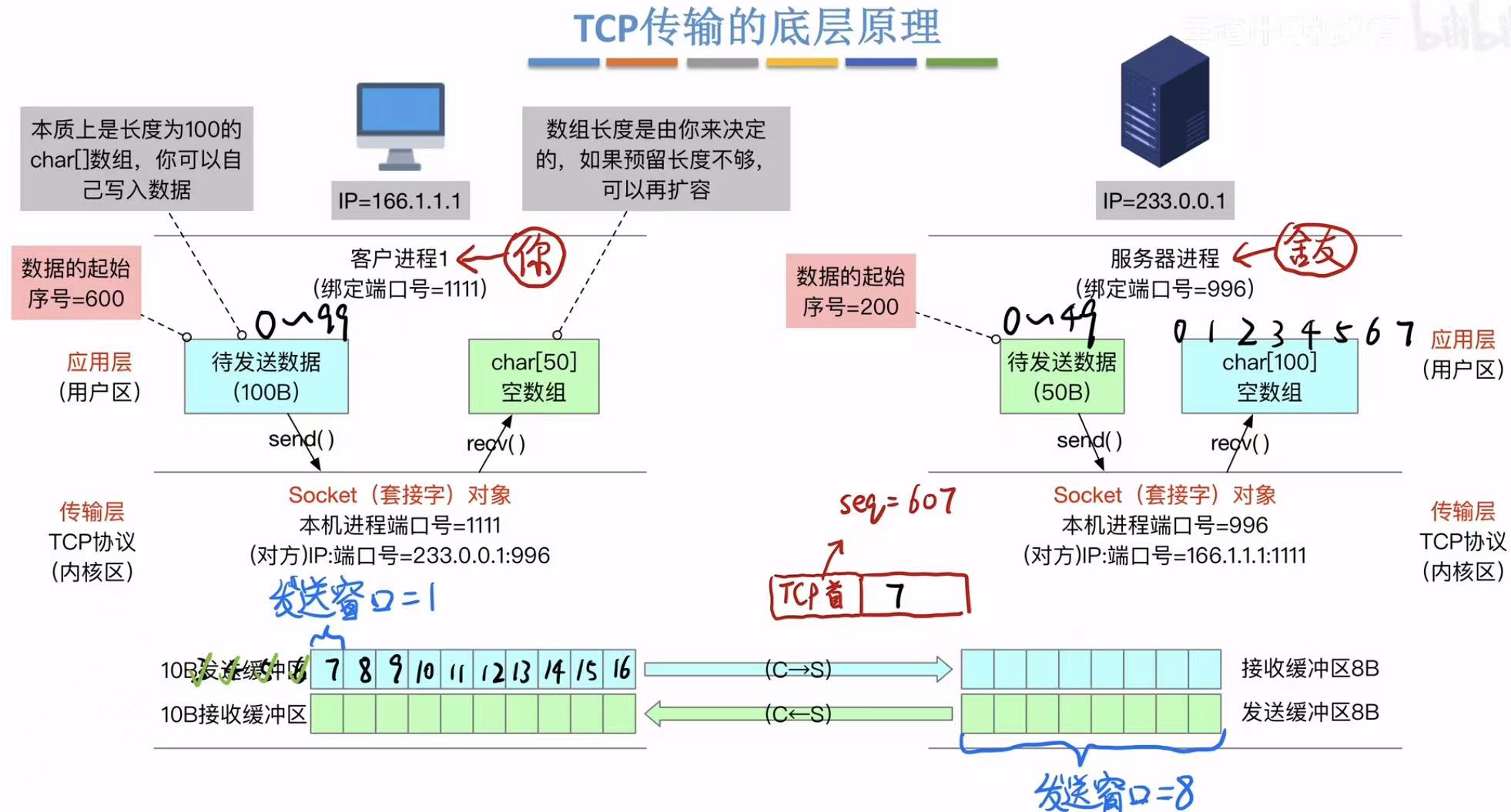 - 应用层:两边的端口号(快递地址)、带起始序号的待发送数据(快递=数组)、即将接收的数据的预留位置(空地儿=空数组)