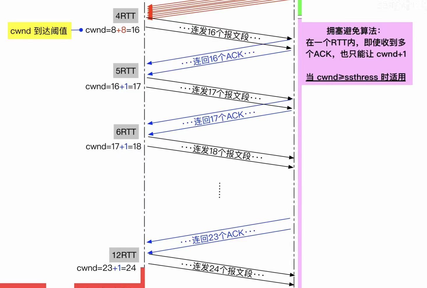 16达到ssthresh,就必须变成一轮只能+1:16-->17-->18-->...-->24