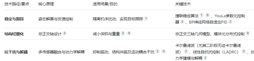 当前的技术发展主要围绕"更智能、更集成、更精确"展开。控制器的设计从经典的PID,向模糊自适应PID、神经网络自适应PID、滑模控制和线性自抗扰控制等方向发展,以提升系统的自适应和抗干扰能力。同时,传感器数据融合算法(如各种改进的卡尔曼滤波)也持续优化,以得到更纯净、准确的姿态信息。在结构上,非正交设计和模块化分布式控制正成为实现吊舱小型化、轻量化的重要思路。