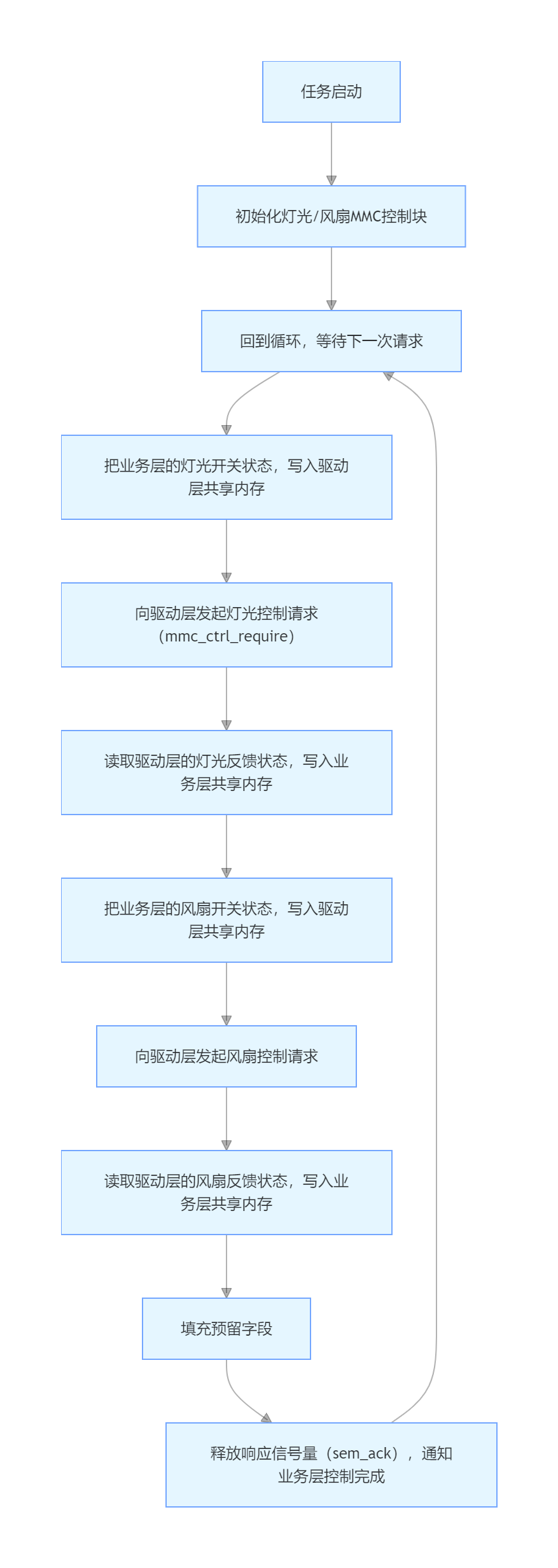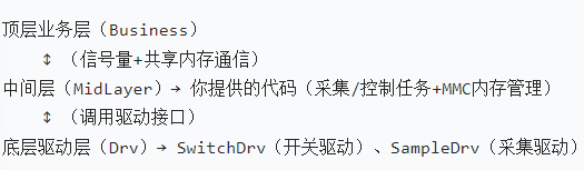 通信方式:通过 MMC(内存控制块)+ 信号量(sem_req/sem_ack)实现跨任务 / 跨层级的同步与数据传递。