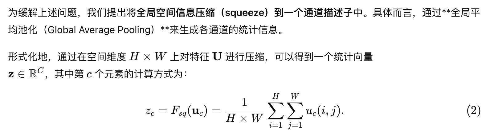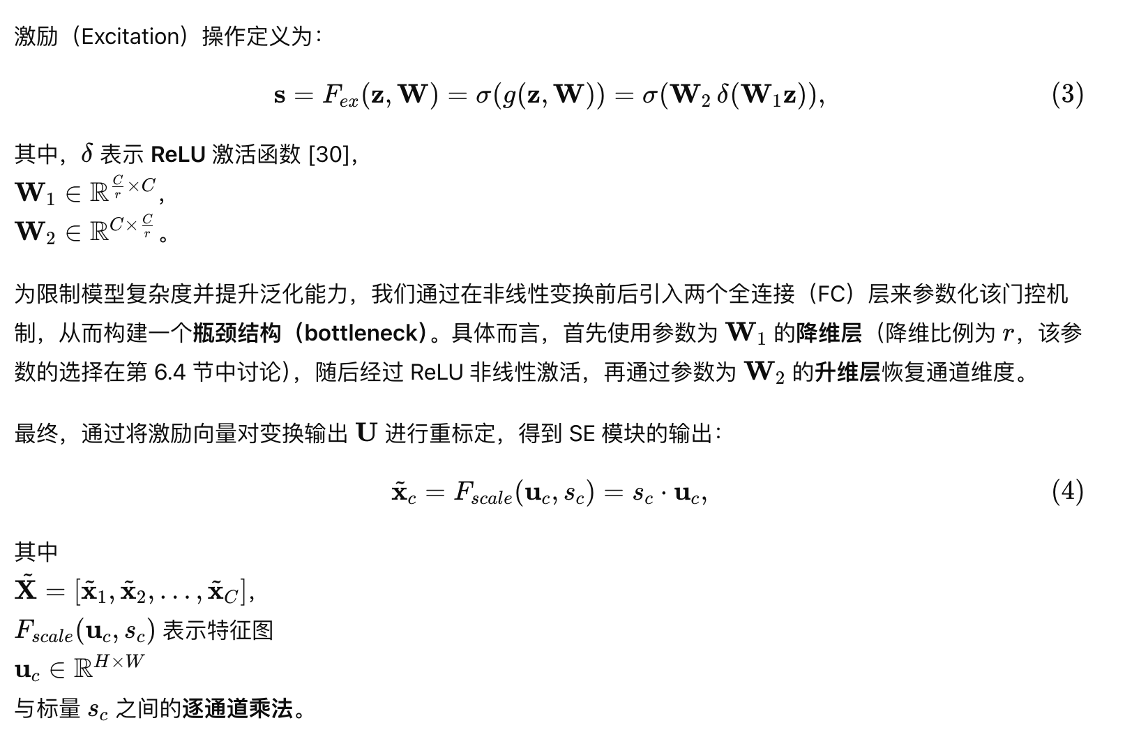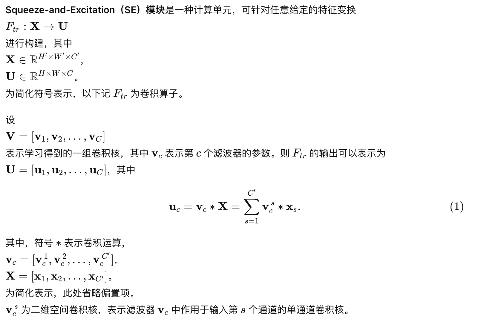 首先,特征 U、经过 Squeeze(压缩)操作 ,该操作在空间维度 H×W上对特征图进行聚合,从而生成一个通道描述子 。该描述子嵌入了各通道特征响应的全局分布信息,使网络能够将来自全局感受野 的信息引入到其较低层中加以利用。随后进行 Excitation(激励)操作 。在该阶段,通过一种基于通道依赖关系的自门控(self-gating)机制,为每个通道学习得到与样本相关的激活权重,这些权重用于控制各通道的激励程度。最后,对特征图 U按通道进行加权重标定,生成 SE 模块的输出特征,该输出可以直接输入到后续网络层中。