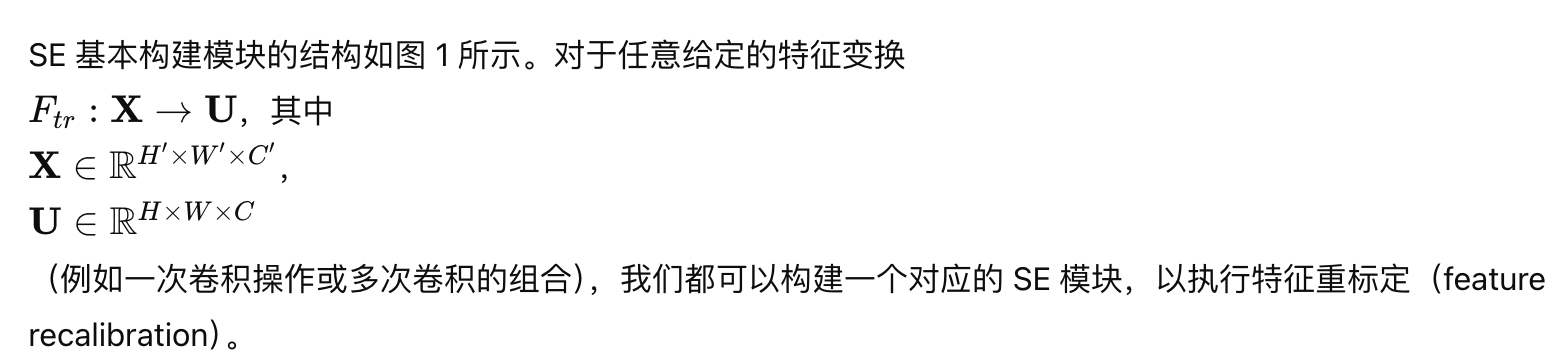由于输出特征是通过对所有输入通道的加权求和得到的,因此通道之间的依赖关系被隐式地编码在卷积核 vc 中 ,但这些依赖关系与滤波器所捕获的空间相关性相互纠缠 。我们的目标是使网络能够增强其对信息量更丰富特征 的敏感性,从而便于后续变换加以利用,同时抑制信息贡献较小的特征。为此,我们提出在特征输入到下一层变换之前,通过 Squeeze(压缩) 和 Excitation(激励) 两个步骤,显式建模通道间的相互依赖关系,对滤波器响应进行重标定。SE 构建模块的结构示意图如图 1 所示。