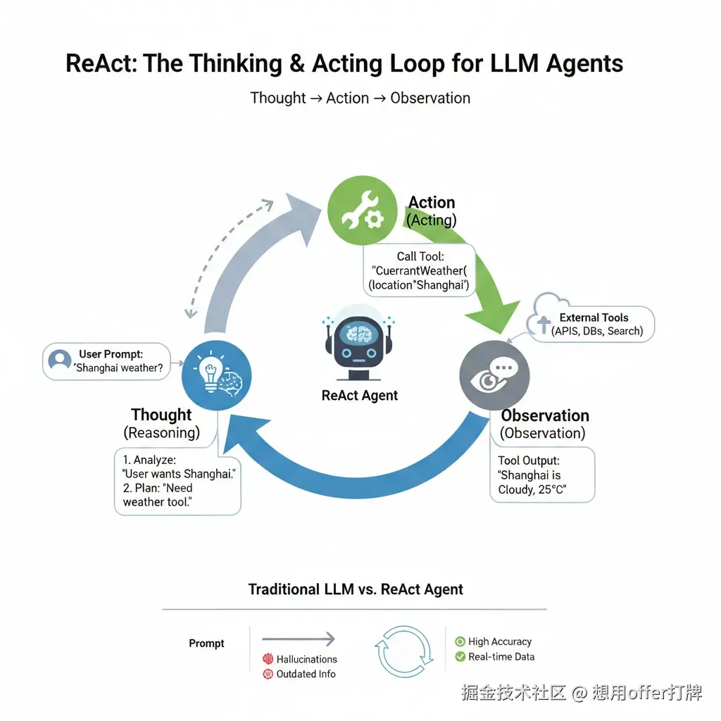 在人工智能领域,大型语言模型(LLM)的出现带来了前所未有的可能性。然而,LLM 并非万能,它们会"幻觉",它们无法实时获取信息。为了弥补这些不足,ReAct 范式 应运而生,它赋予了 LLM 像人类一样"思考"(Reasoning)和"行动"(Acting)的能力,从而构建出更强大、更可靠的 ReAct Agent。