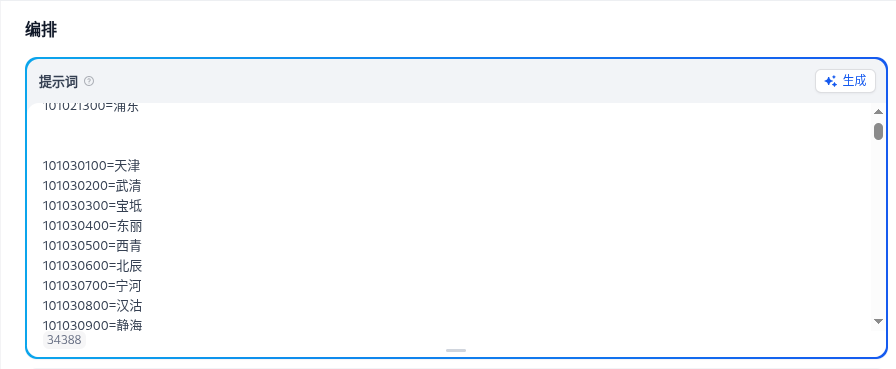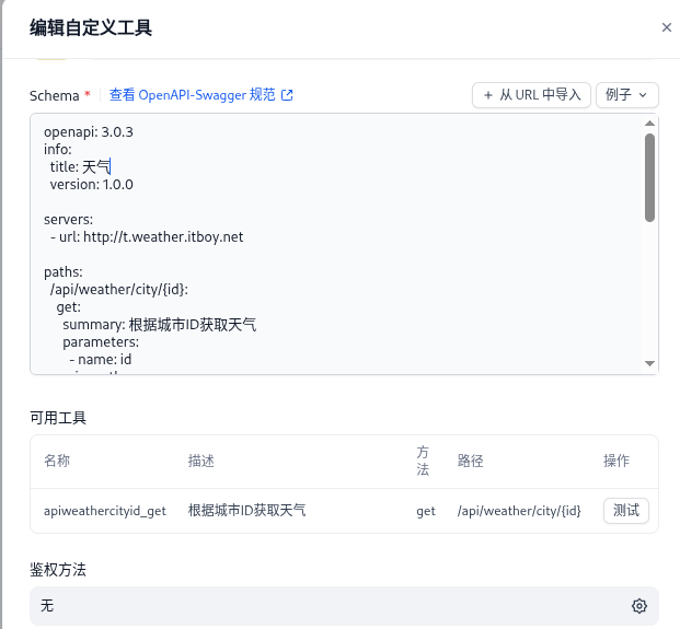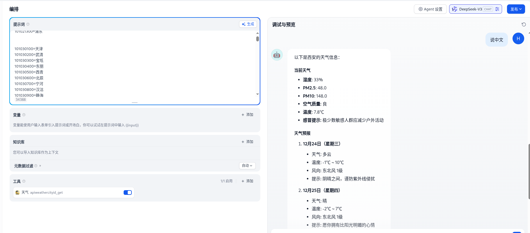 摘要:城市编码解析工具创建指南 本文介绍了如何使用Dify平台创建城市编码解析工具,分为两个主要步骤: 创建自定义工具:通过Dify工具菜单创建新工具,设置城市编码映射关系(如101010100=北京等) 构建Agent应用:在工作室创建空白Agent应用,并配置相应的提示词模板。文中提供了完整的城市编码与名称映射表,包含北京、上海等主要城市及其下属区域的编码对应关系。 该工具可将数字编码自动转换为对应的城市/区域名称,适用于需要处理标准化城市编码的场景。