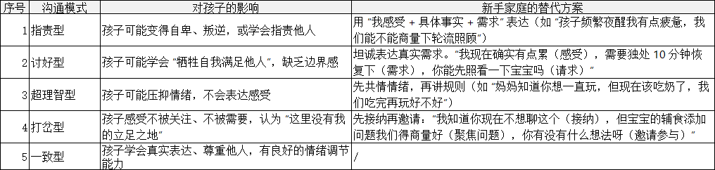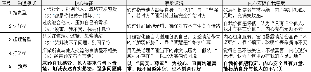2)萨提亚提出 4 种经典家庭错误沟通模式和推荐一致性沟通模式如下 ,直接影响孩子的表达能力和关系处理方式: