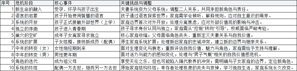 家庭生命周期会面临10个危机,每个危机都是对家庭系统旧有平衡的挑战 。要求家庭调整规则、角色和沟通模式。若能以开放、学习的心态应对,危机便成为家庭共同成长的契机;若固守旧模式,则会导致功能不良。