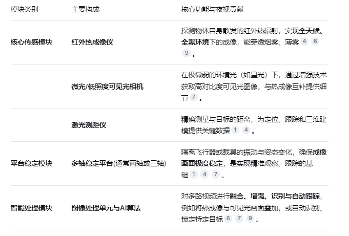 工业吊舱的夜视能力,并非依赖单一部件,而是由多种传感模块、稳定平台和智能处理单元协同实现的多光谱感知系统。其核心目的是在低光、无光或恶劣天气下,穿透黑暗、烟雾和薄雾,获取清晰的图像与精确的目标信息。