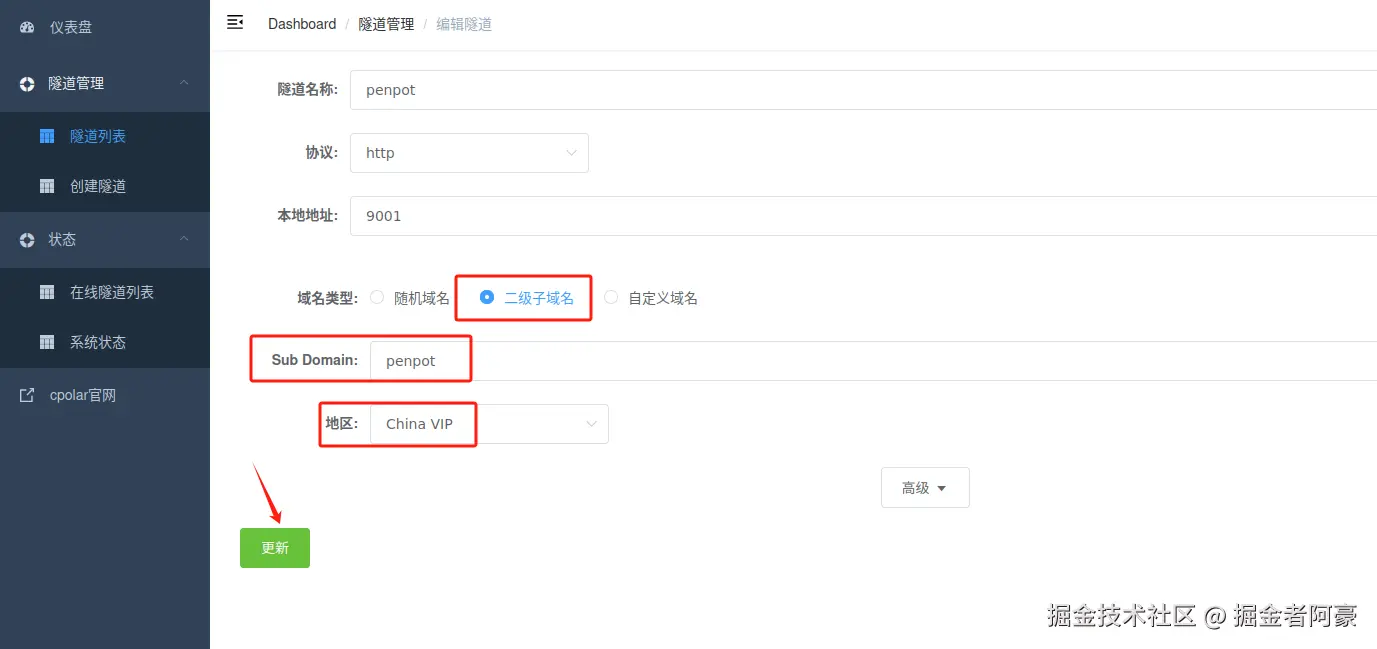 修改隧道信息,将保留成功的二级子域名配置到隧道中