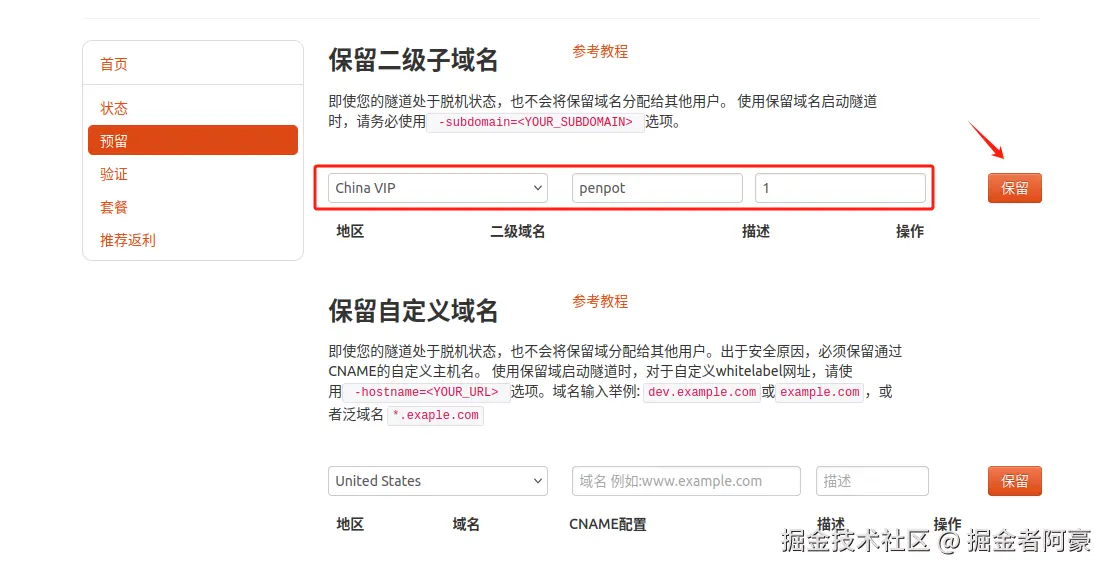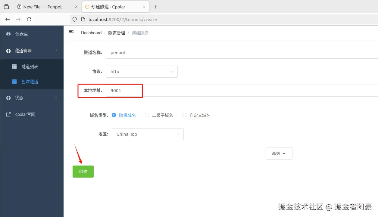 - 隧道名称:可自定义,本例使用了: Penpot 注意不要与已有的隧道名称重复