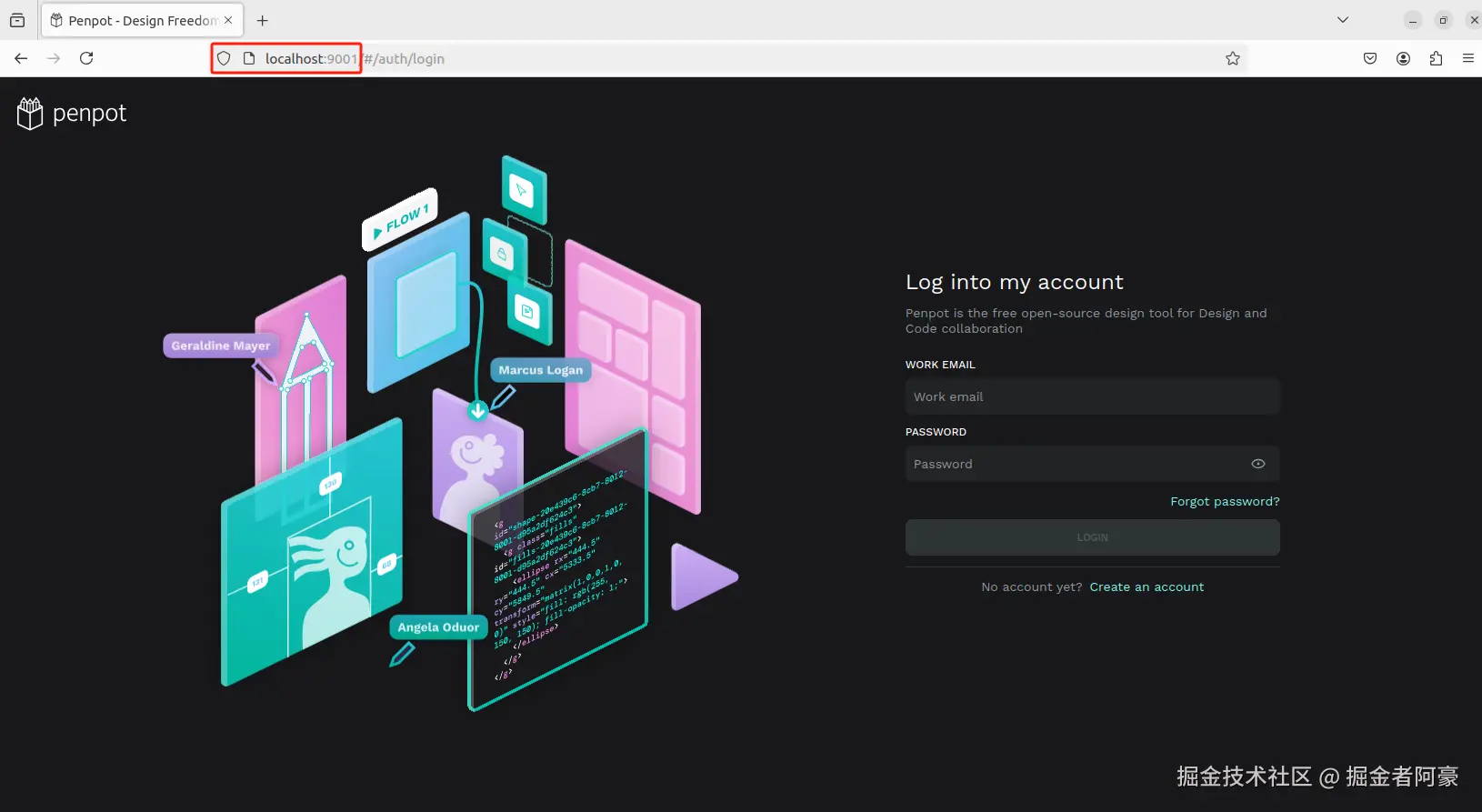 接下来我们就可以通过任意浏览器进行访问测试,打开一个浏览器输入localhost:9001,可以看到进入到了Penpot的登录界面,注册一个用户名和密码。