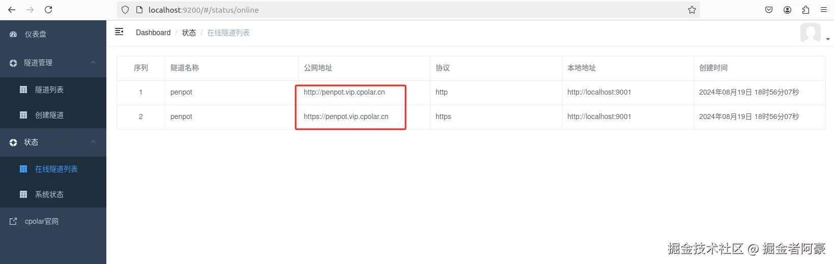 创建成功后,打开左侧在线隧道列表,可以看到刚刚通过创建隧道生成了两个公网地址,接下来就可以在其他电脑(异地)上,使用任意一个地址在浏览器中访问即可。