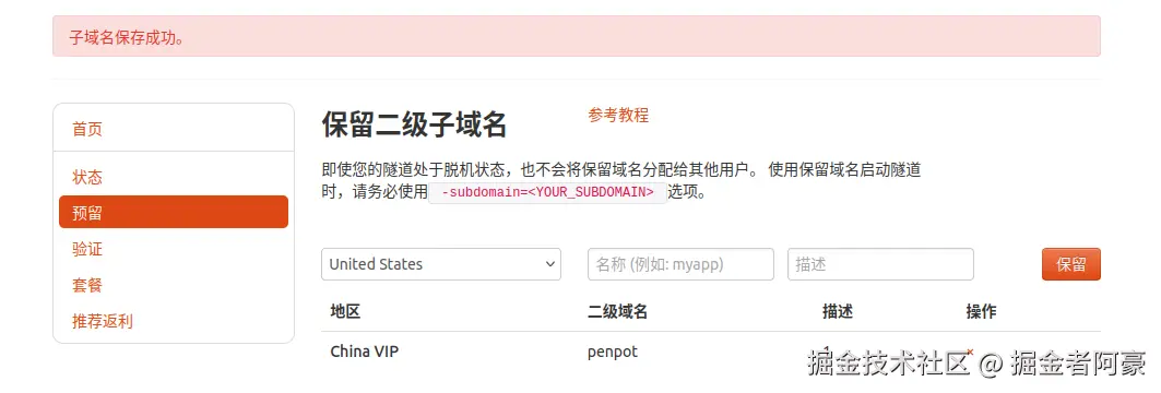 登录cpolar官网,点击左侧的预留,选择保留二级子域名,地区选择china vip top,然后设置一个二级子域名名称,填写备注信息,点击保留。