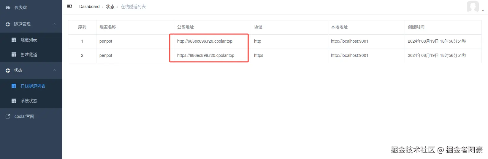更新完成后,打开在线隧道列表,此时可以看到随机的公网地址已经发生变化,地址名称也变成了保留和固定的二级子域名名称。
