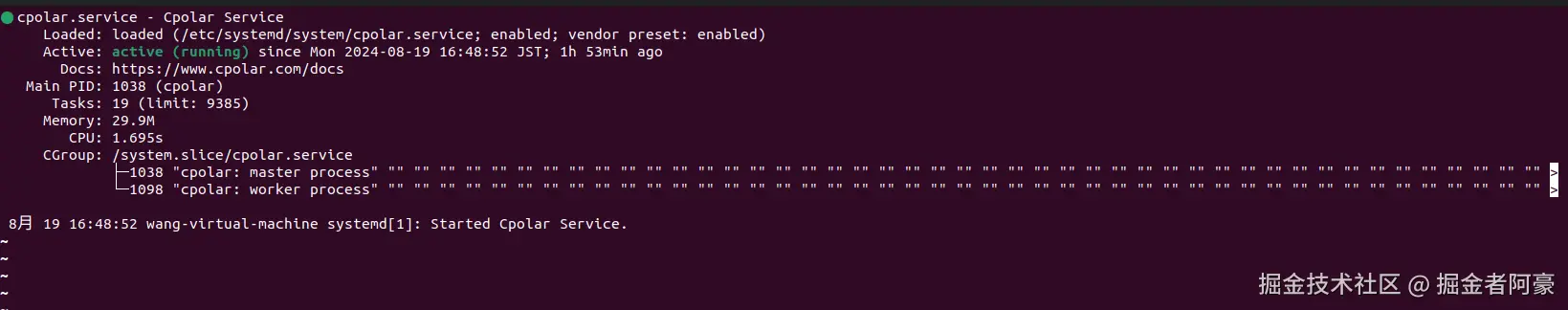 安装完成后,执行下方命令查看cpolar服务状态:(如图所示即为正常启动)