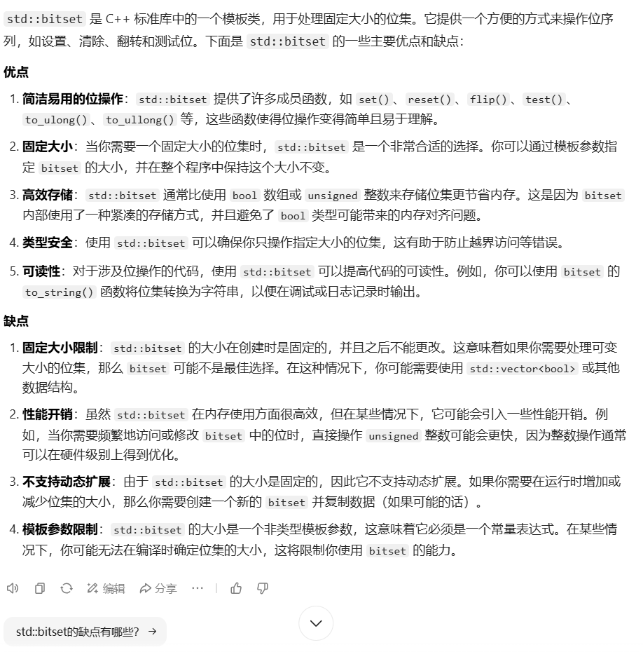 bitset 是 C++ 标准模板库(STL)中的一个容器类,专门用于存储和操作固定大小的二进制位序列。它在内存使用和位操作性能方面非常高效。