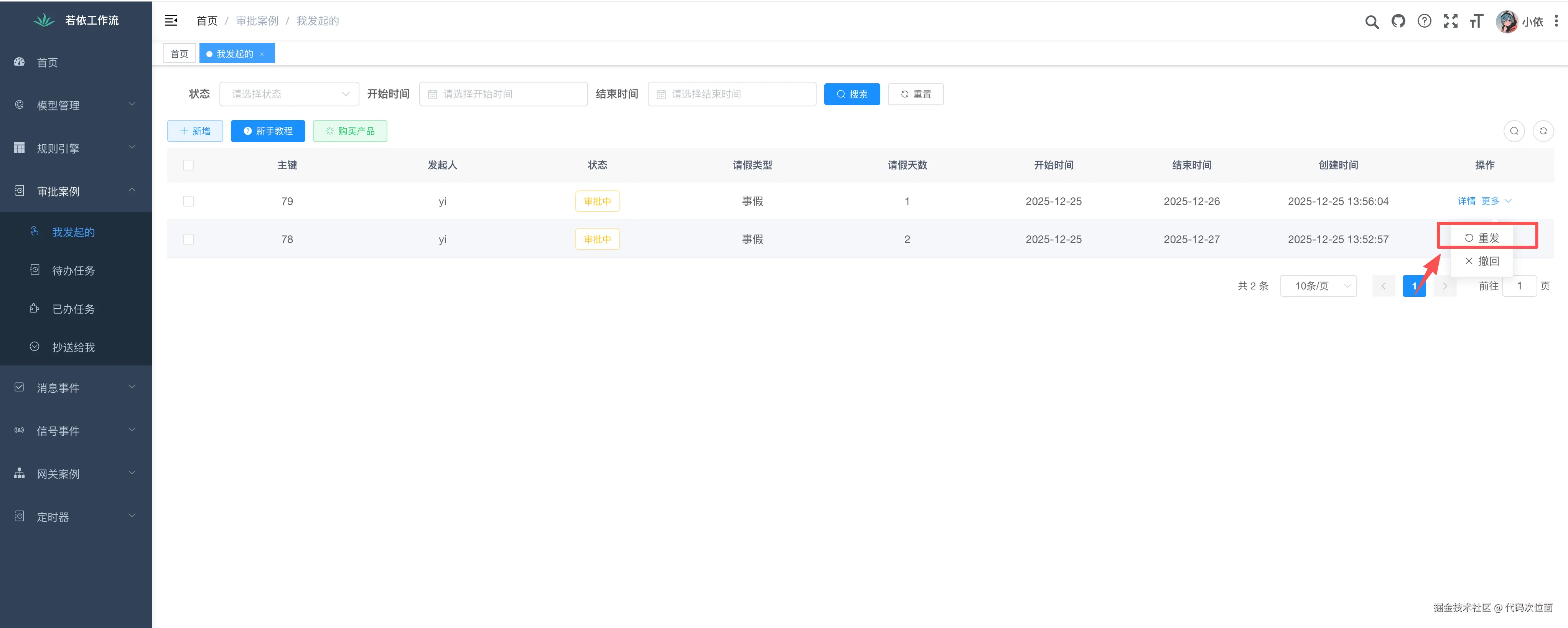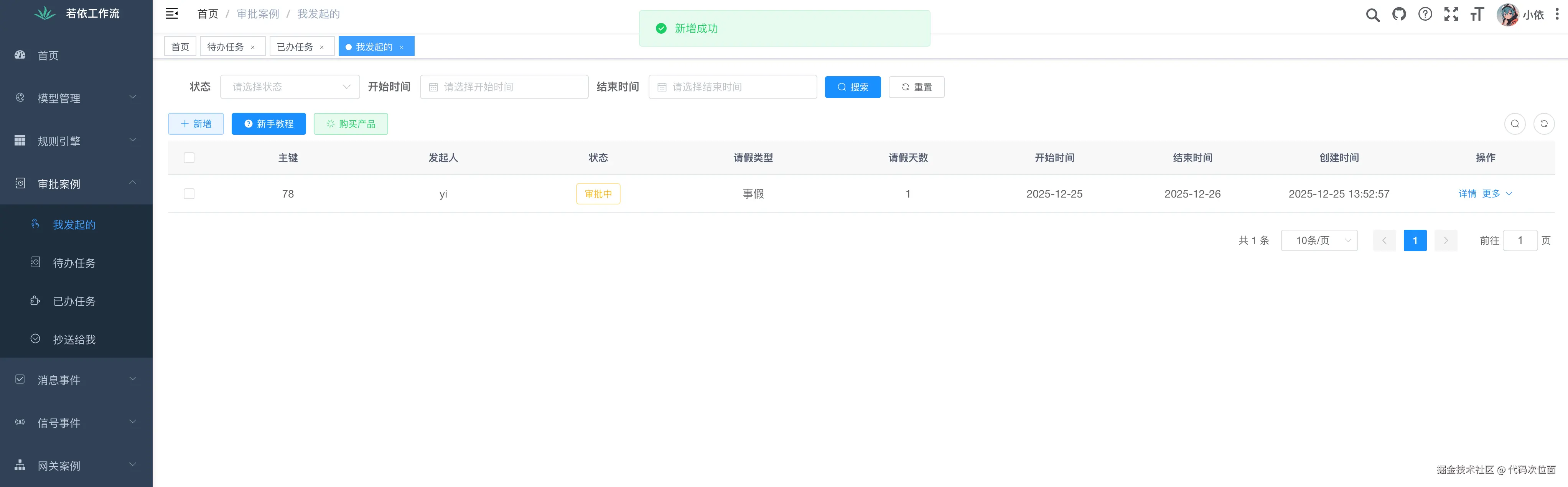 以小依的账号登陆, 在我发起的菜单,提交一个请假申请
