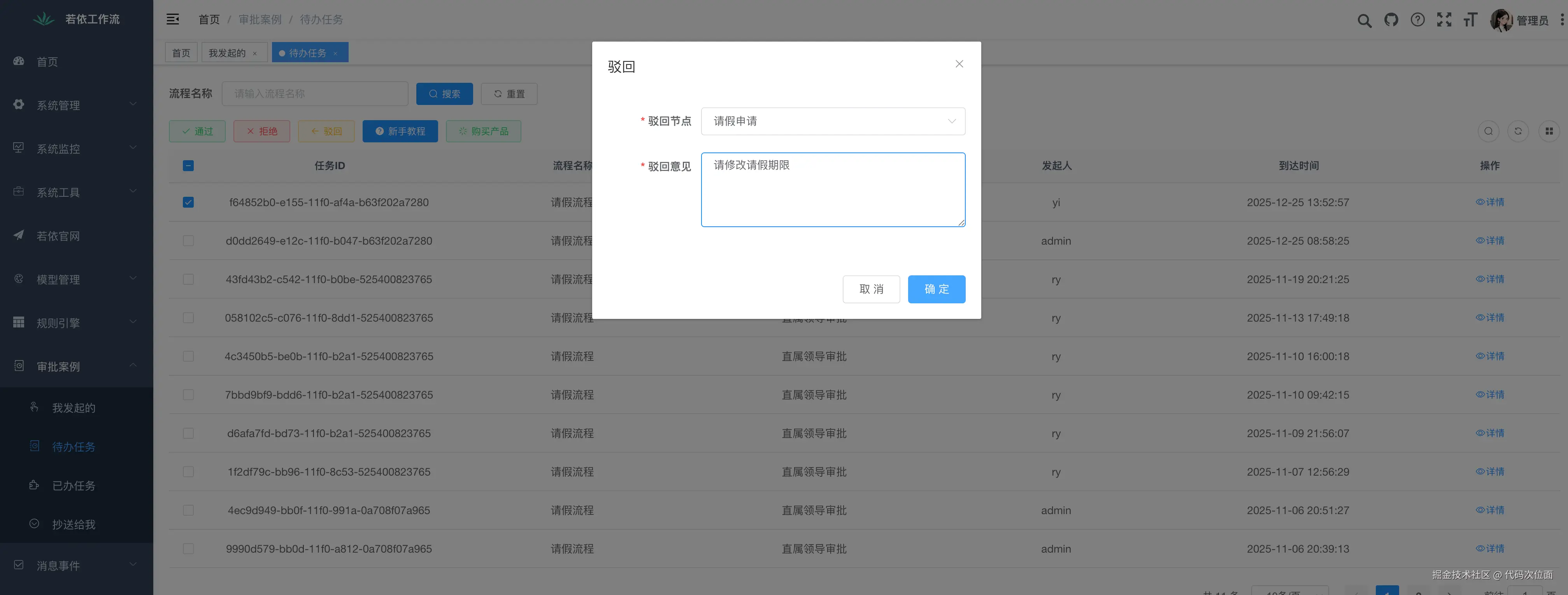 审批人, admin登陆,将请假申请驳回,并给出驳回意见。
