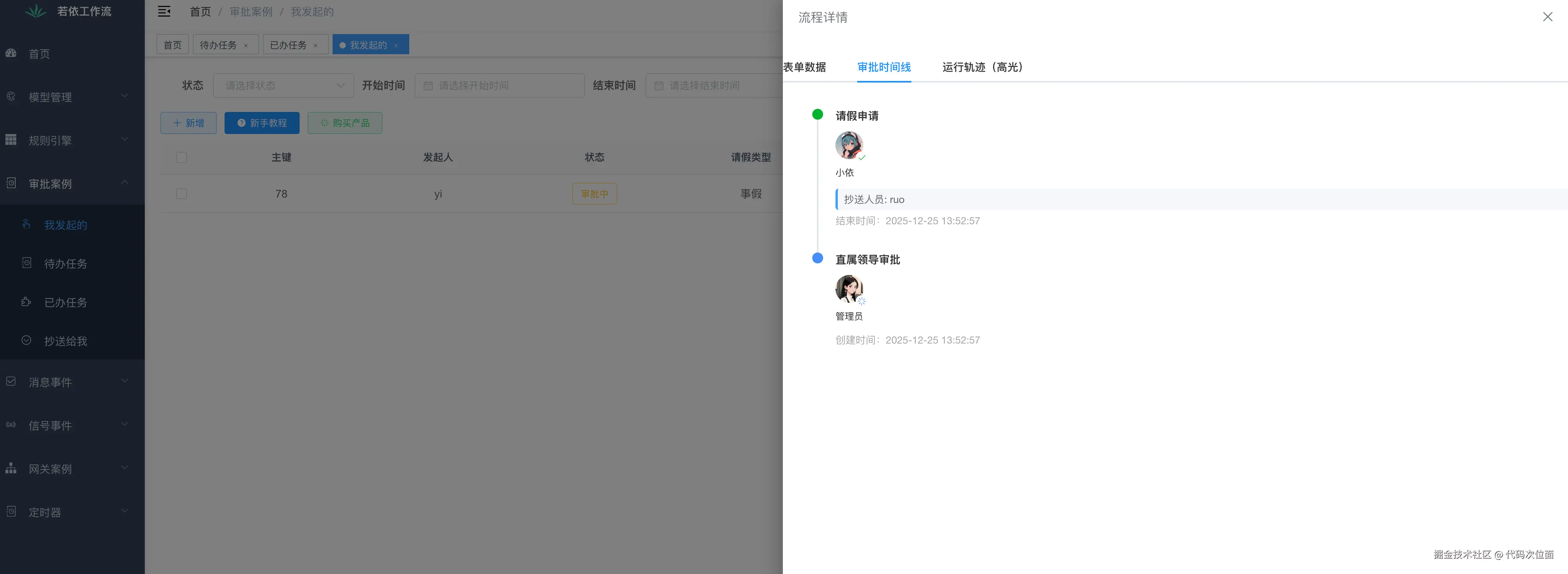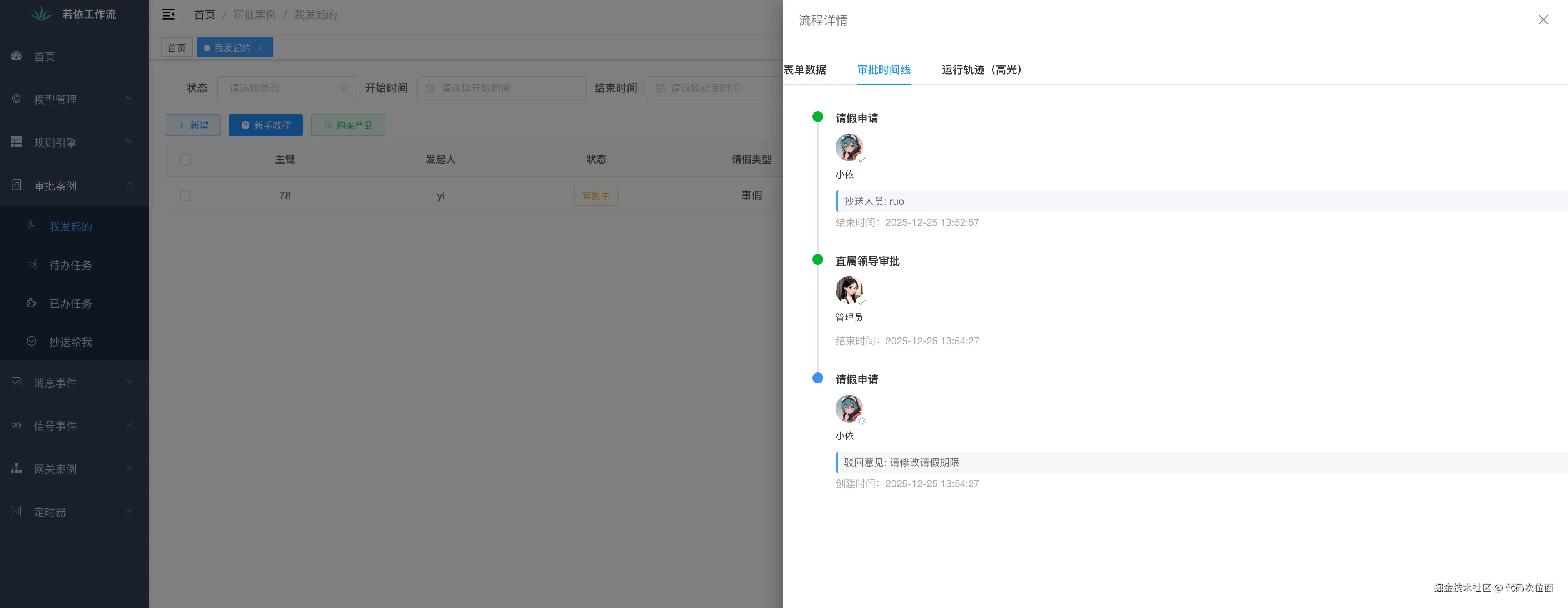 审批人, admin登陆,将请假申请驳回,并给出驳回意见。审批时间线可以看到变化了