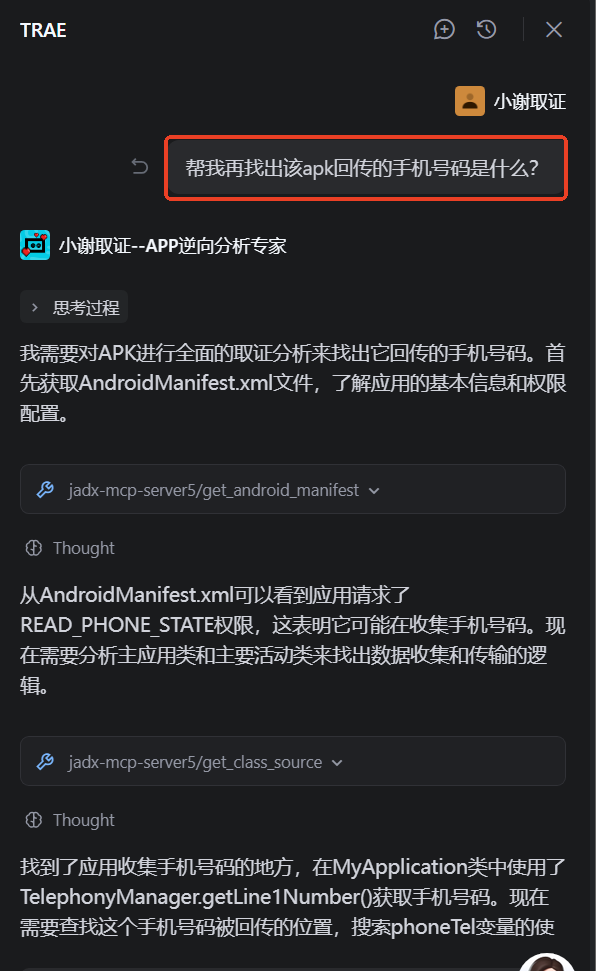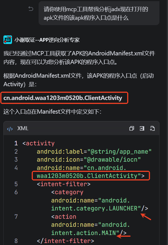 我们使用自然语言"请你使用mcp工具帮我分析jadx现在打开的apk文件的该apk程序入口点是什么"跟Trae进行交互