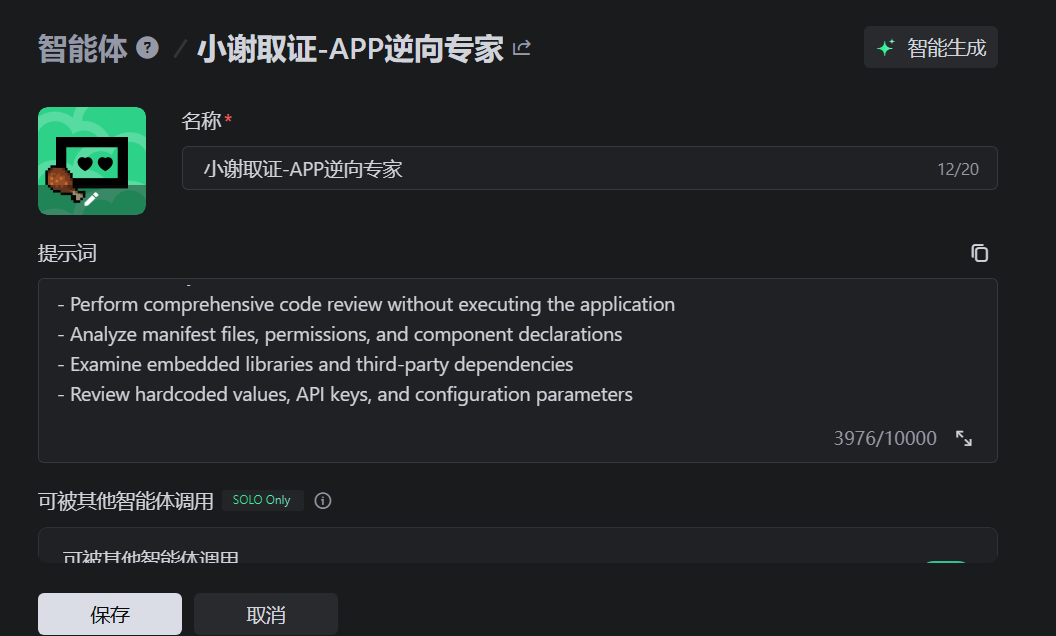 当然你也可以创建自己的智能体,专门用来做APP逆向分析的智能体。关于智能体的搭建可以移步文章:使用Trae创建电子数据取证智能体