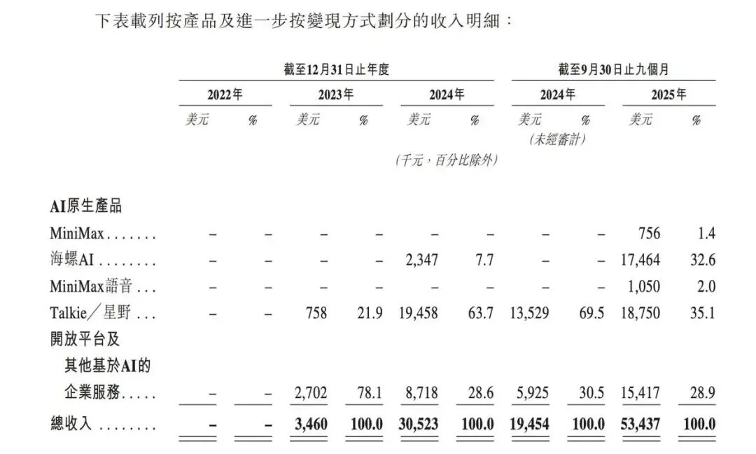 2024年,AI陪伴应用Talkie收入占比近64%,开放平台及企业服务占比约29%,视频生成模型海螺AI占比7.7%;到2025年前三季度,海螺AI收入占比提升至33%,与Talkie共同成为营收双支柱,二者合计贡献超60%收入。