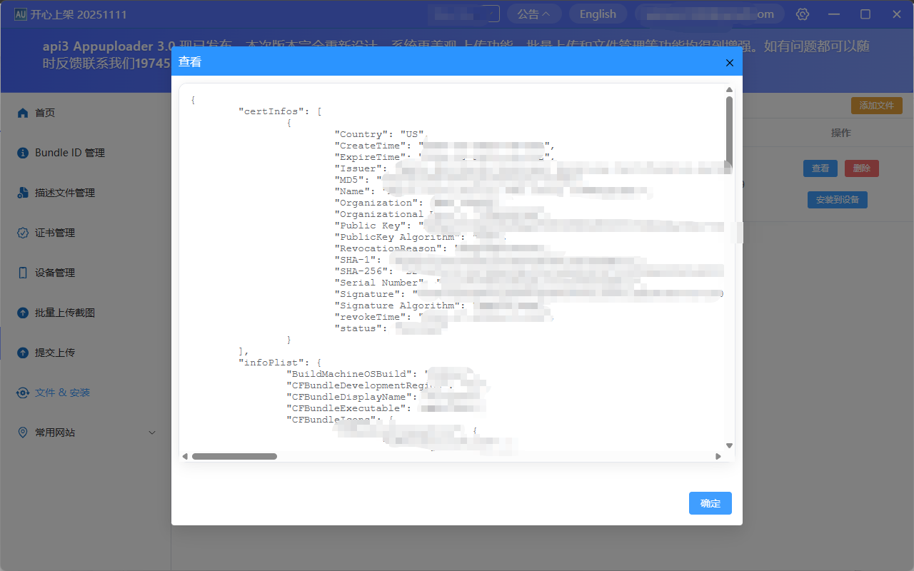 通过 开心上架(Appuploader)查看 mobileprovision 文件内容,可以明确看到描述文件类型、绑定关系以及使用的证书是否符合当前阶段需求。